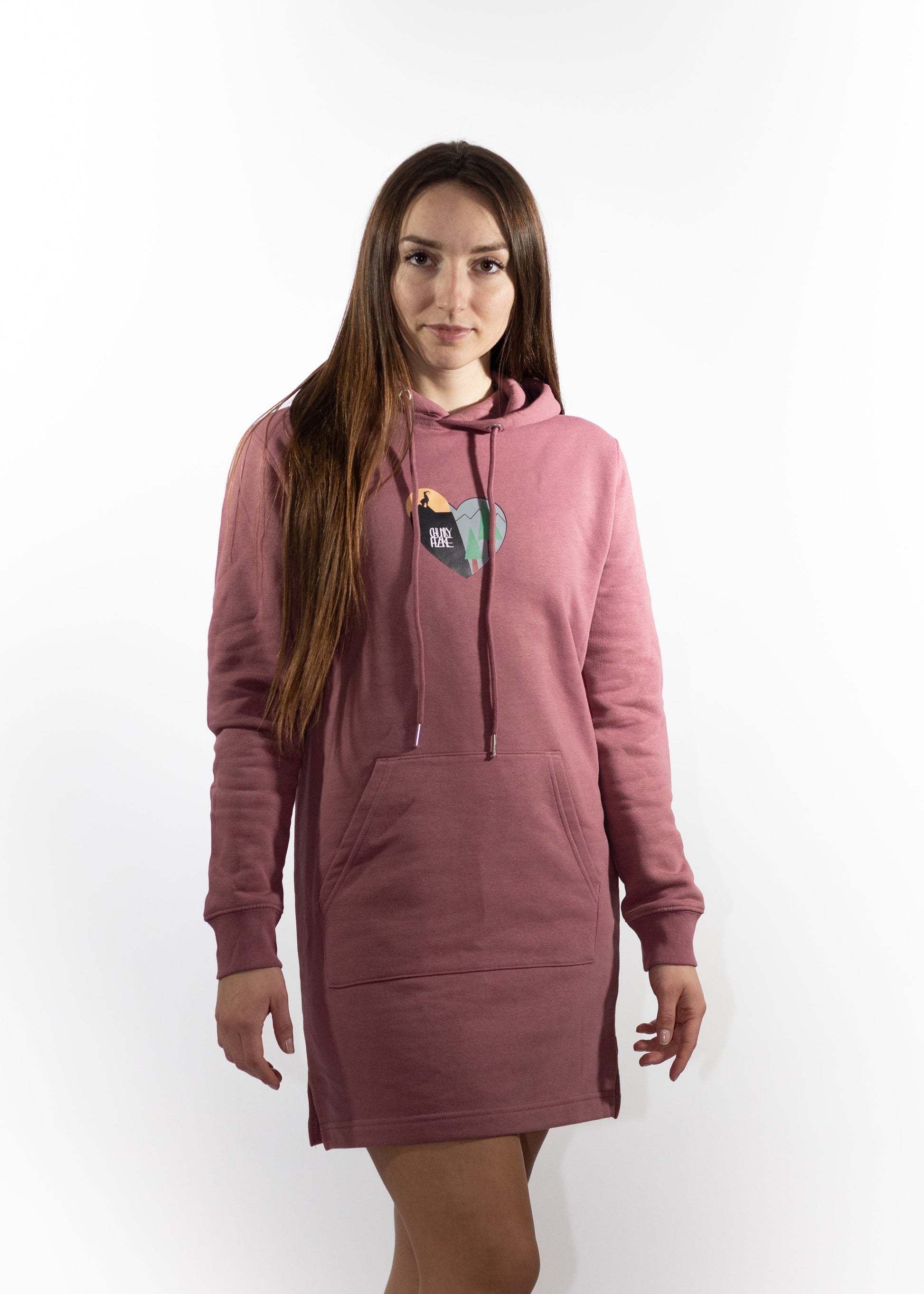 Ein schönes Sweatkleid mit Kapuze und Kängurutasche, das ein gemütlicher Begleiter für den Alltag ist. Die Kapuze ist mit Jersey gefüttert und der Sweatstoff innen angeraut, sodass das Kleid herrlich kuschlig ist. Der Brustprint zeigt: